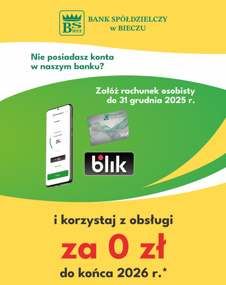 Nie posiadasz konta w naszym banku? Załóż rachunek osobisty do 31 grudnia 2025 r. i korzystaj z obsługi za 0 zł do końca 2026 r. -
